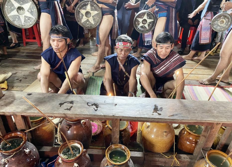 Hội đồng già làng thực hiện nghi thức cúng trong Lễ cúng Bến Nước. Ảnh: Ngọc Thu