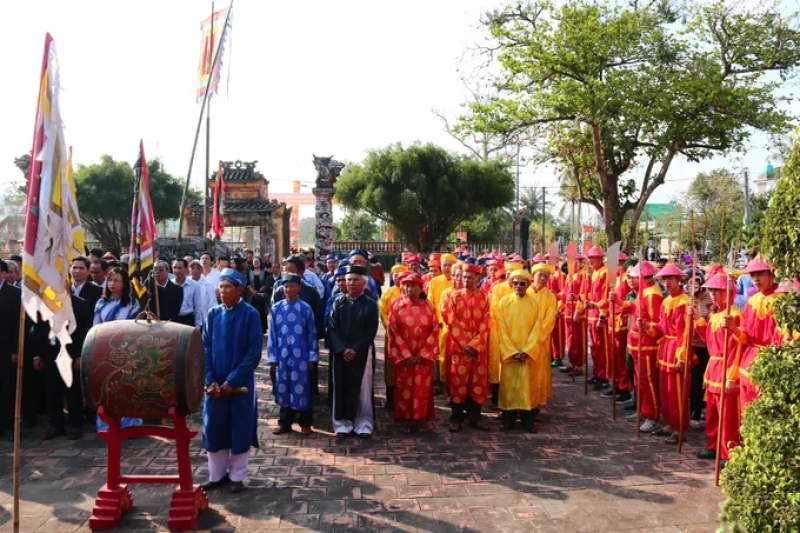 Các cô gái trong trang phục truyền thống, bưng mâm lễ vật kinh dâng lên Hoàng đế Quang Trung và các tướng sĩ nhà Tây Sơn. Ảnh: Ngọc Minh