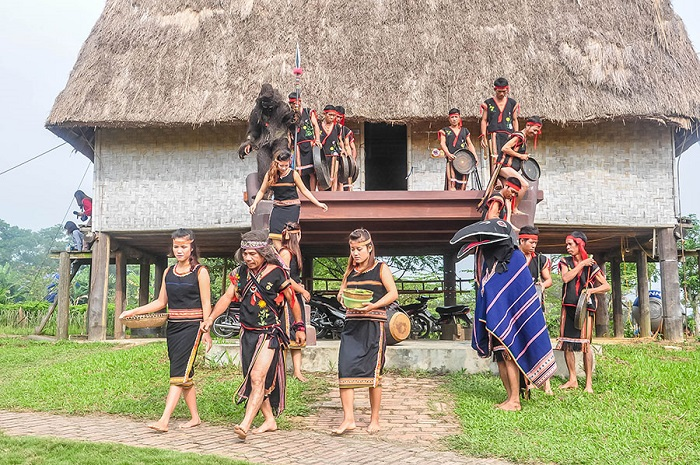 Làng Văn hoá – Du lịch Đăk răng Đến làng Đắk Răng, du khách sẽ được xem điệu múa cồng chiêng – múa xoang của người Giẻ-Triêng. Đây là một trong những nét đẹp truyền thống và cũng là niềm tự hào của đồng bào dân tộc tại vùng Bắc Tây Nguyên. Đội cồng chiêng tổ chức dưới sự chỉ huy của già BRôi Vẻ – nghệ nhân đa tài và là già làng tâm huyết. Cái độc đáo trong điệu múa cồng chiêng là được hoà tấu với các nhạc cụ dân tộc và những bài dân ca Giẻ – Triêng. Các nhạc cụ này đều được chế tác bởi đôi tay tài hoa và điêu luyện của nghệ nhân bản địa. Trong trang phục màu đỏ với sắc phối hoa văn sặc sỡ cùng chiếc khăn đội đầu điệu múa cồng chiêng hòa cùng các nhạc cụ trở nên ma quái và bí ẩn khiến bao lữ khách bị mê hoặc và đắm say bởi sức hút lạ kỳ.