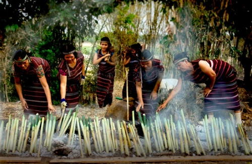 Món cơm trong ống lồ ô (Cơm lam) Cơm lam là cái tên rất quen thuộc với nhiều người. Đây là một trong những món ăn rất đặc biệt và được lòng mọi người. Món này được nấu từ loại gạo nếp rẫy và nướng trên than hồng. Khi chín cơm lam rất dẻo, mùi thơm, quyện theo vị ngọt ngọt của ống lồ ô. Có thể nói, khó có món cơm nào nấu từ nồi hoặc chõ lại ngon được như vậy. Cơm lam thông thường hay được ăn kèm với muối vừng hoặc các loại thịt. Đây là một đặc sản rất dân dã và độc đáo của đồng bào dân tộc nơi đây.