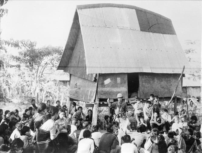 Đồng bào Kon Tum quây quần bên các chiến sỹ giải phóng trong buôn làng dọc đường 19 trong những ngày Tây Nguyên được giải phóng. Ảnh: Tư liệu/TTXVN